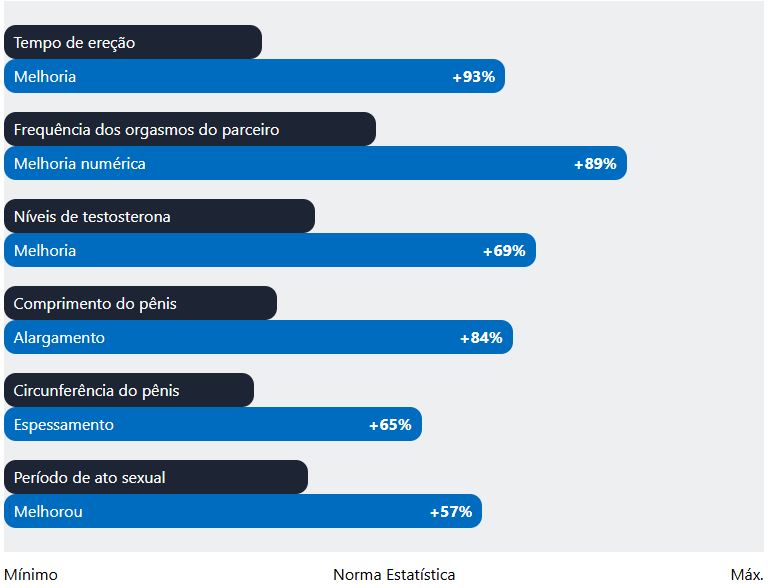 Os resultados deste método são claros: aumento significativo no tamanho do pênis (até 9,8 centímetros com tratamento completo), aumento da ereção, com excitação imediata após a ingestão, aumento do desejo sexual, restauração da secreção de testosterona, retorno à condição ideal, eliminação de gordura e aumento da massa muscular, aumento do volume de sêmen.